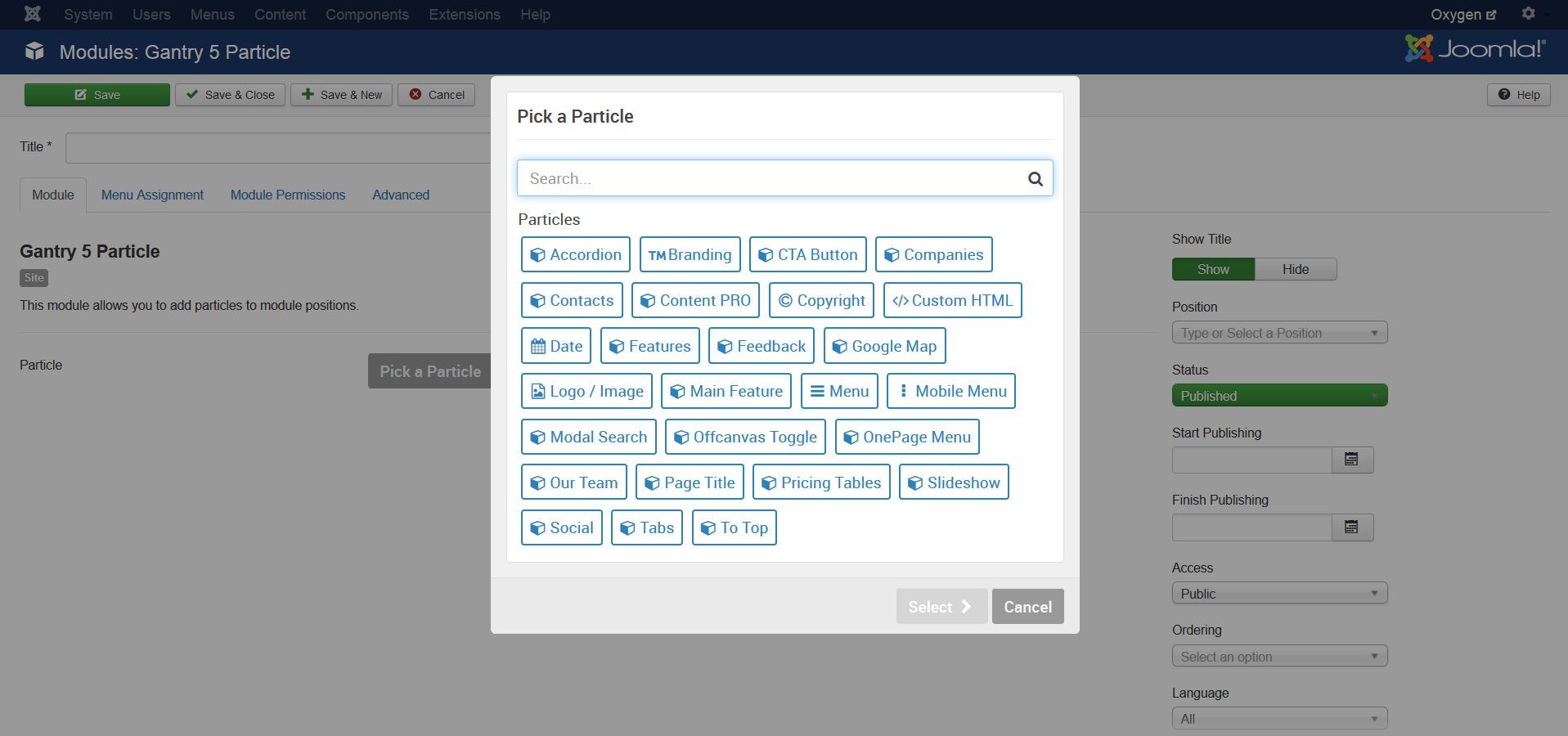 Gantry 5's new Particles system makes it easy to create, configure, and manage content blocks. Create new Particles in minutes, adjust their settings at multiple levels from global down to the individual block, and more!